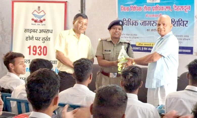 देहरादून। जिला विधिक सेवा प्राधिकरण के तत्वाधान में गांधी इंटर कॉलेज डिस्पेंसरी रोड देहरादून में सचिव जिला विधिक प्राधिकरण हर्ष यादव के निर्देशन में प्राविधिक कार्यकर्ता उमेश्वर सिंह रावत द्वारा एक विधिक जागरूकता एवं साइबर अपराध विषय पर एक जागरूकता शिविर का आयोजन किया गया। शिविर में प्राविधिक कार्यकर्ता उमेश्वर सिंह रावत ने छात्रो को विधिक सेवा प्राधिकरण से मिलने वाली समस्त निशुल्क सेवाओं, 11 मई 2024 को प्रातः 10:00 बजे से 5:00 बजे तक होने वाली राष्ट्रीय लोक अदालत में कौन-कौन से 12 बाद निपटाए जाएंगे उनके बारे में विस्तृत जानकारी दी।