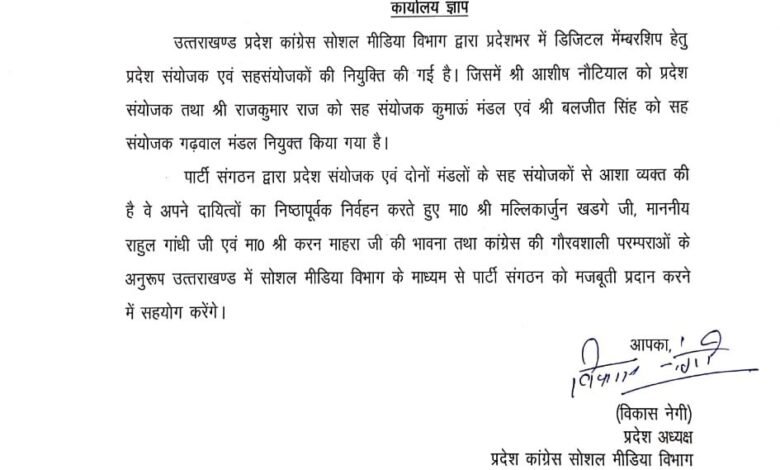 देहरादून। उत्तराखण्ड प्रदेश कांग्रेस सोशल मीडिया विभाग द्वारा प्रदेशभर में डिजिटल मेंम्बरशिप के लिये प्रदेश संयोजक एवं सहसंयोजकों की नियुक्ति की गई है। जिसमें आशीश नौटियाल को प्रदेश संयोजक तथा राजकुमार राज को सह संयोजक कुमाऊं मंडल एवं बलजीत सिंह को सह संयोजक गढ़वाल मंडल नियुक्त किया गया है। उक्त जानकारी देते हुए प्रदेश कांग्रेस सोशल मीडिया विभाग के प्रदेश अध्यक्ष विकास नेगी ने बताया कि प्रदेशभर में पार्टी का डिजिटल मेंम्बरशिप कार्यक्रम चलाया जा रहा है जिसके तहत प्रदेश संयोजक एवं मंडलवार सहसंयोजकों की नियुक्ति की गई है। पार्टी संगठन द्वारा प्रदेश संयोजक एवं दोनों मंडलों के सह संयोजकों से आशा व्यक्त की है वे अपने दायित्वों का निश्ठापूर्वक निर्वहन करते हुए मल्लिकार्जुन खडगे, राहुल गांधी एवं करन माहरा की भावना तथा कांग्रेस की गौरवशाली परम्पराओं के अनुरूप उत्तराखण्ड में सोशल मीडिया विभाग के माध्यम से पार्टी संगठन को मजबूती प्रदान करने में सहयोग करेंगे।